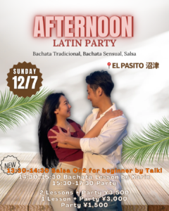 Afternoon Latin Party ✨※時間30分後ろ倒しに変更しました!! 月イチ開催のアフタヌーンパーティー🥰今回のレッスンは私のBachataに加え、TaikiのOn2 ビギナーレッスンも追加😍😍✨現在メキ […]